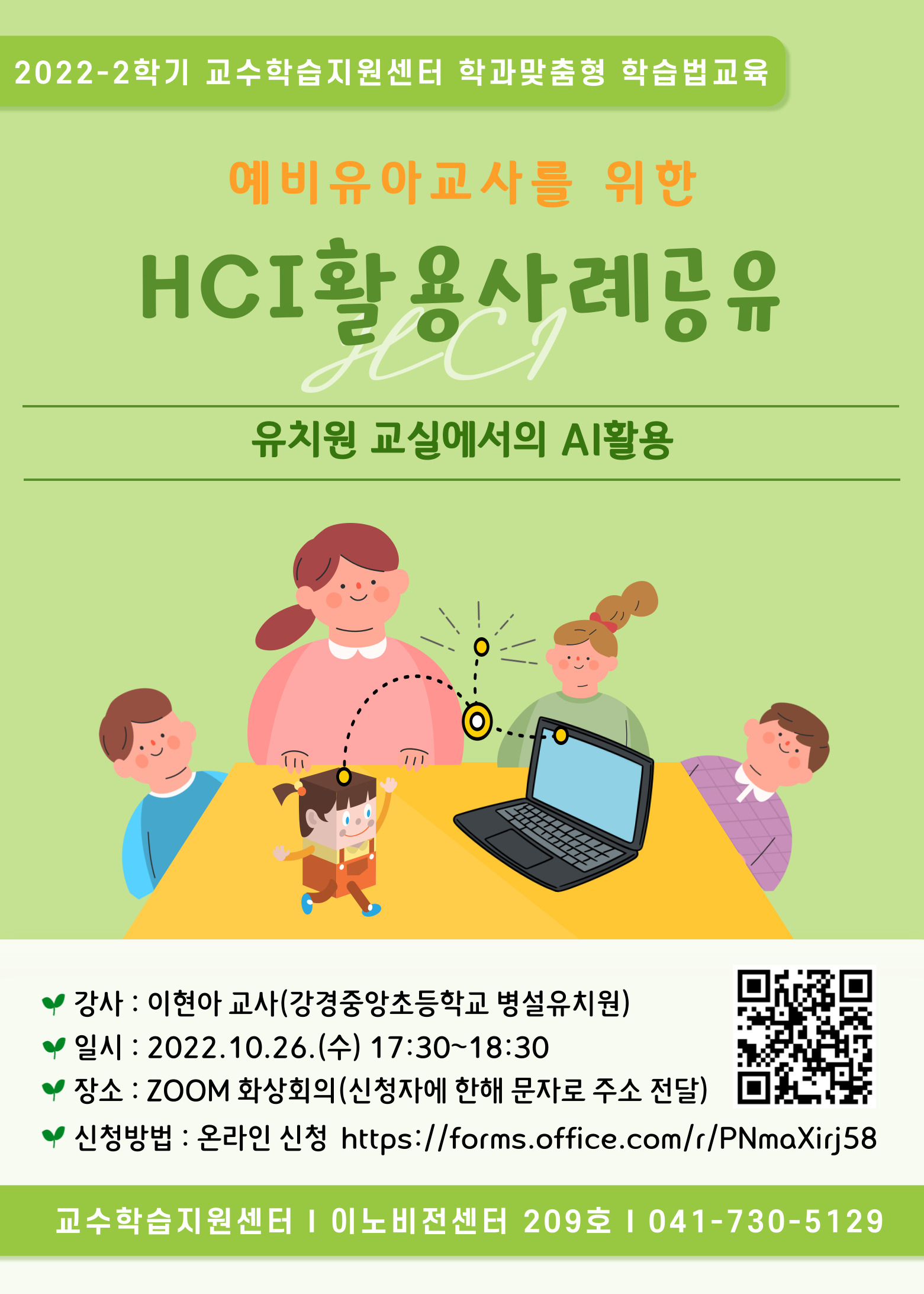 - 제목 : 예비 유아교사를 위한 HCI 활용 사례 공유 - 유치원 교실에서의 AI 활용 - 강사 : 이현아 교사(강경중앙초등학교 병설유치원) - 일정 : 10월26일(수) 17:30~18:30 - 장소 : ZOOM 화상회의 (신청자에 한해 문자로 주소 전달) - 신청방법 : 온라인 신청 - 대상 : 유아교육과 재학생 전체학년(1~4학년) |