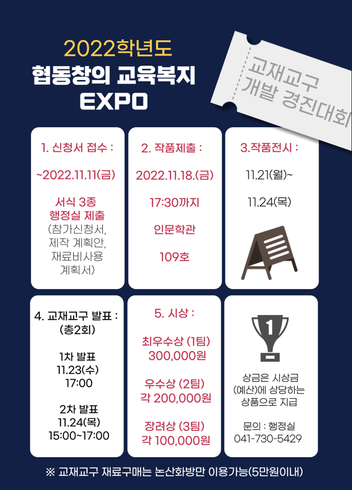 | 제목 | [일정변경]2022학년도 협동창의 교육·복지 EXPO 교재교구 개발 경진대회 안내 | ||||