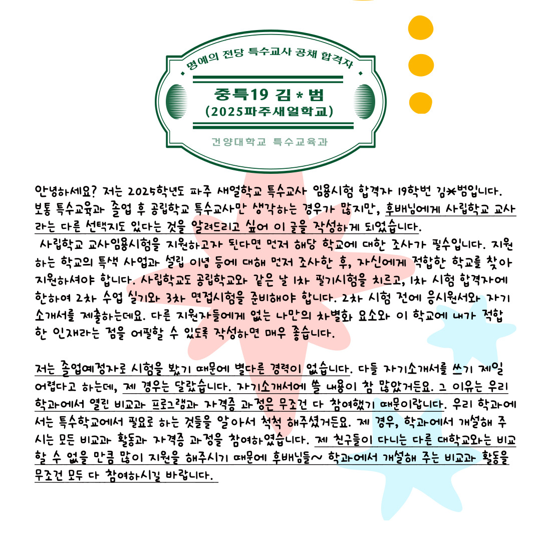 중등특수 전공으로 졸업하신 19학번 김*범 선배의 공채 합격 후기입니다.