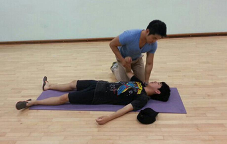 퍼스널트레이너 자격증 실기수업을 받는 모습입니다.