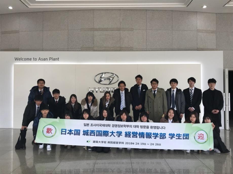 2018년 2월 21일 수요일, 병영경영학과 학생들과 조사이 국제 대학 학생들은 오전에는 충남 아산시에 위치한 현대 공장에서 공장에 관한 소개와 자동차 공정 과정 10단계를, 오후에는 경기도 오산에 위치한 아모레퍼시픽(Amorepacific) 공장에 방문하여 회사의 기원, 화장품 발전의 흐름, 공장 내부 모습을 견학하였습니다.