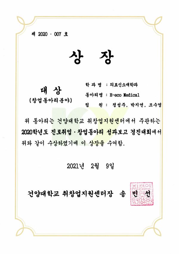 의료신소재학과 4학년 정성주, 박지연, 조수영 학생이 ‘2020학년도 진로취업ㆍ창업동아리 성과보고 경진대회‘에서 대상을 수상했습니다. [관련 세부 정보] - 행사명 : 2020학년도 진로취업ㆍ창업동아리 성과보고 경진대회 일시 : 2021.02.04 장소 : 건양대학교 ( 비대면 발표 ) 수상 내역 : 대상 관련 기사 : http://www.newsband.kr/news/articleView.html?idxno=339620