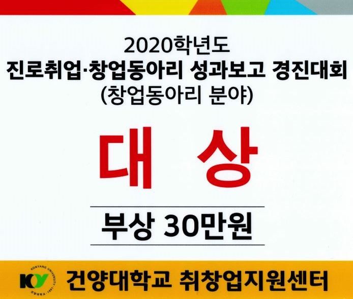 | 제목 | [수상] 2020학년도 진로취업ㆍ창업동아리 성과보고 경진대회 – 대상 | ||||
