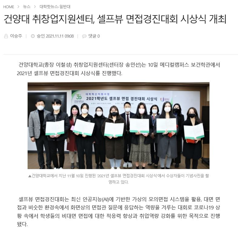의료신소재학과에 재학중인 4학년 전승호 학생이 건양대 취창업지원센터에서 진행한 2021년 셀프뷰 면접경진대회(AI 기반 가상의 모의면접 시스템을 활용, 비대면 면접 역량을 겨루는 대회)에서 수상하였습니다.