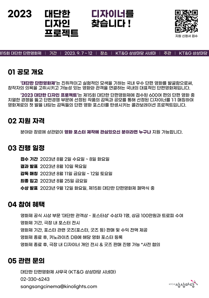 1. 공모명 : 2023 대단한 디자인 프로젝트 2. 공모 개요- ‘2023 대단한 디자인 프로젝트’는 제15회 대단한 단편영화제에 접수된 600여편의 단편 영화 가운데, 치열한 경쟁을 뚫고 단편경쟁 부문에 선정된 작품의 감독들과 디자이너의 1:1 매칭을 통해 영화계로의 첫 발을 내딛는 감독들의 단편 영화 포스터를 제작 지원하는 콜라보레이션 프로젝트입니다. 3. 지원 자격 분야와 장르에 상관없이 영화 포스터 제작에 관심 있으신 분이라면 누구나 지원 가능합니다. 4. 진행 일정- 접수 기간: 2023년 8월 2일(수) ~ 8월 8일(화)- 결과 발표: 2023년 8월 10일(목)- 감독 매칭: 2023년 8월 11일(금) ~ 8월 12일(토)- 디자인 마감(최종 입고): 2023년 8월 25(금)- 수상 발표: 2023년 9월 12일 화요일, 제15회 대단한 단편영화제 폐막식 중 5. 지원 방법2023 대단한 디자인 프로젝트 지원 신청서 접수(링크)https://docs.google.com/forms/d/e/1FAIpQLScN0kiO7euhUufYcV2cT2O2KulfiLJLc60rwO70PPqAAyAwng/viewform?usp=sf_link 6. 시상 내역 및 참여 혜택상영작 매칭으로 제작이 최종 완료된 포스터는 아래와 같이 혜택이 제공된다.● 디자이너- ‘대단한 관객상 - 포스터상’ 수상자 1명(팀), 상금 100만원 + 트로피 수여- 키노라이츠, 디트릭스 등 영화 공식 DB로 포스터 등록- 극장 온/오프라인 채널 영화 개별 홍보 시 활용- 영화제 기간 포스터 전시- 영화제 기간 포스터 엽서 등 굿즈 판매 및 수익 제공- 영화제 종료 후 KT&G 상상마당 시네마 로비에서 디자이너 개인 전시 및 굿즈 판매 가능(사전협의) * 시상 내역 및 참여 혜택은 주최 측의 상황이나 심사 결과에 따라 변경될 수 있다. 7. 문의대단한 단편영화제 사무국(KT&G 상상마당 시네마)