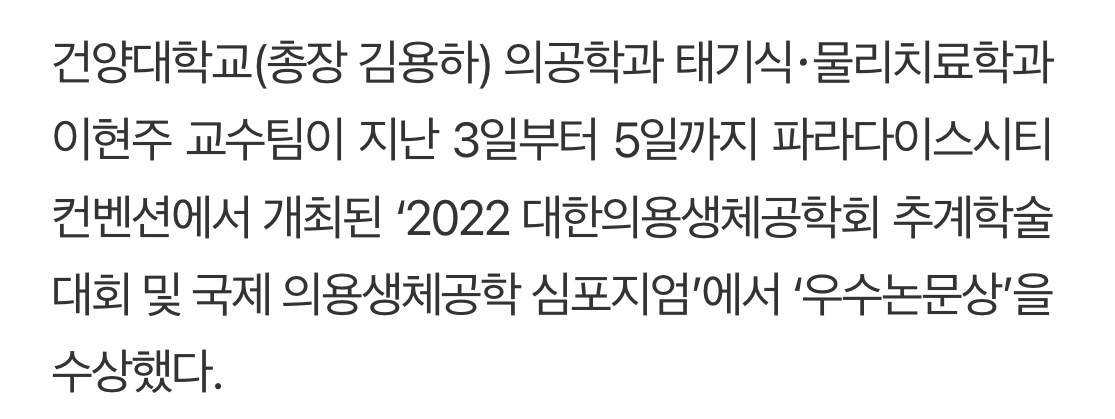 『 건양대 한국재활복지공학회 우수논문상 관련 기사 』글의 상세내용을 확인하는 표로 제목, 부서명, 등록일, 조회, 첨부, 내용으로 나뉘어 설명합니다.