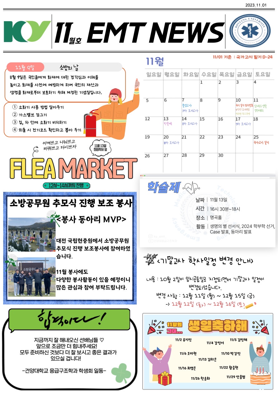 『 2023년도 11월 EMT NEWS 』글의 상세내용을 확인하는 표로 제목, 부서명, 등록일, 조회, 첨부, 내용으로 나뉘어 설명합니다.