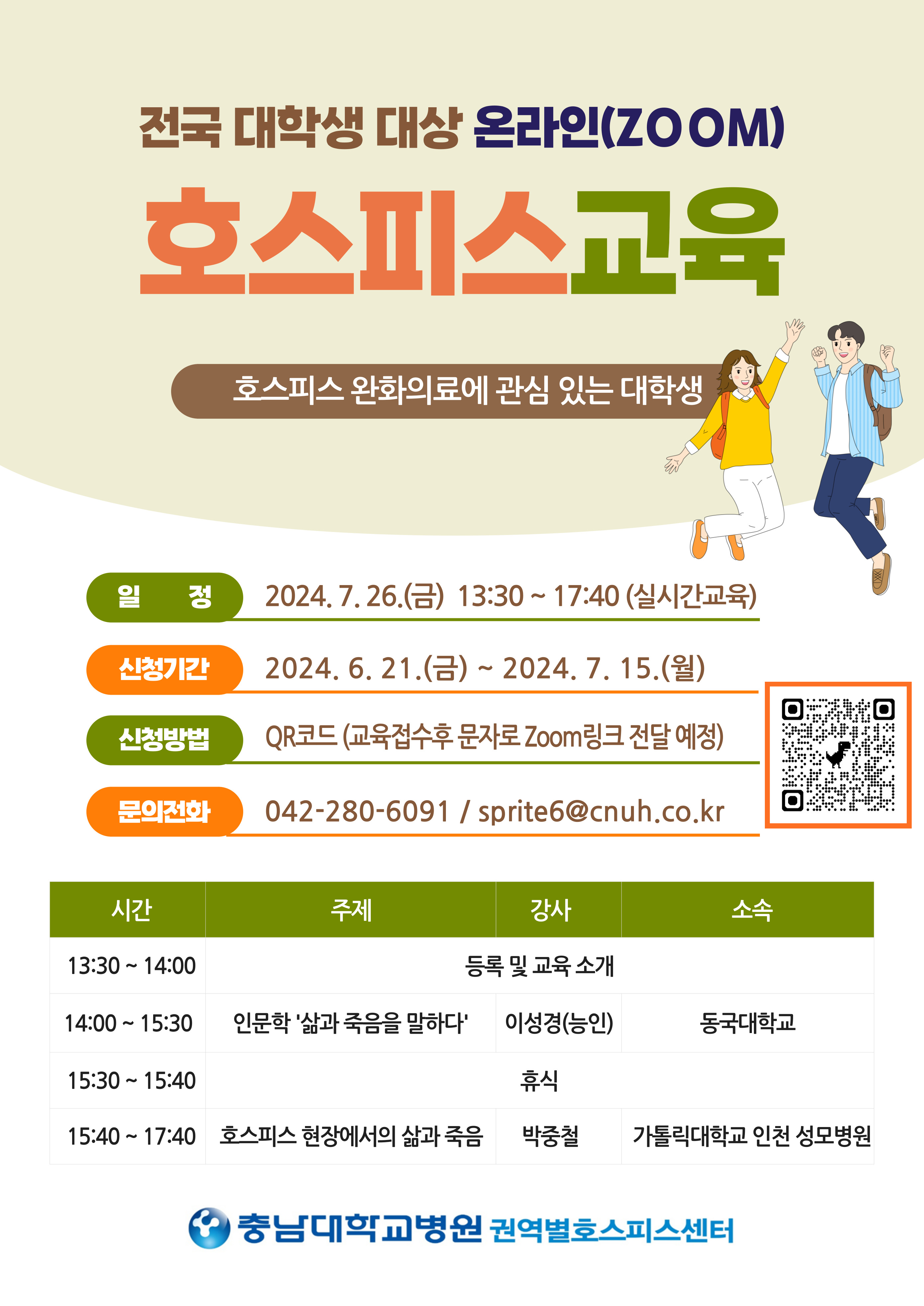 『 전국 대학생 대상 호스피스 온라인 교육 수강 안내 』글의 상세내용을 확인하는 표로 제목, 부서명, 등록일, 조회, 첨부, 내용으로 나뉘어 설명합니다.