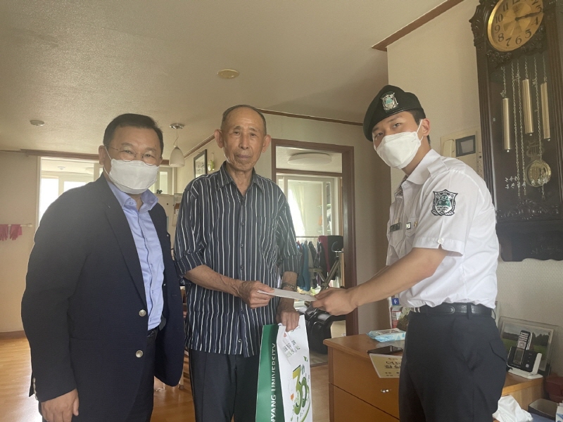 건양대 군사경찰대학, 6.25 72주년 맞아 참전용사 위문 건양대학교(총장 이철성) 군사경찰대학(학장 윤형호) 교수 및 학생들이 6.25 전쟁 발발 72주년을 맞아 지난 25일 6.25 전쟁 참전용사를 방문해 감사의 뜻을 전하는 시간을 가졌다. 이번 참전용사 방문은 한국자유총연맹 충남도지부와 논산지회 지원으로 이루어졌으며 건양대 군사학과 교수 3명과 재학생 6명이 각각 논산시에 거주하는 임건교 씨(84세), 최상기 씨(89세), 계룡시에 거주하는 이순혁 씨(92세) 자택을 방문해 미리 준비한 감사편지와 소정의 위문금을 전달했다. 이번 참전용사 방문에 참가한 건양대 군사학과 박기열 학생은 “오늘날 우리가 누리고 있는 자유는 그냥 얻어진 것이 아니라 나라가 어려움에 처했을 때 참전용사와 같은 분들이 자신의 몸을 아끼지 않고 지켜온 덕분이라는 점을 다시 한번 되새기게 됐다”며 앞으로 훌륭한 장교가 되어 나라를 지키는데 최선을 다하겠다고 밝혔다. 이날 학생들을 만난 참전용사 이순혁 씨는 “매년 이렇게 찾아주니 조국을 위해 6.25전쟁에 참여했던 한 사람으로서 너무도 감사하다”며 “최근 우크라이나 전쟁과 북한의 미사일 발사 등 더욱 불안해지는 세계 정세에 있어 튼튼한 안보가 뒷받침되지 않으면 또다시 어려움에 처할 수 있다는 사실을 잊지 않았으면 좋겠다. 미래의 대한민국을 이끌어갈 학생들이 나라의 소중함을 다시 한 번 되새기고 더욱 최선을 다해달라”고 당부했다.