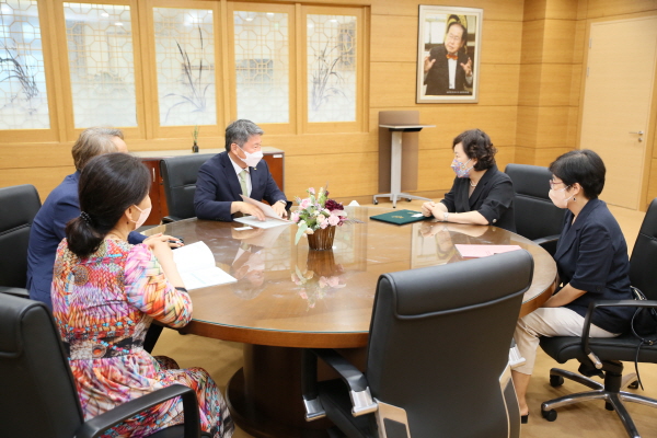 건양대 김용하 총장(가운데)이 드림위드 앙상블 이옥주 이사장(오른쪽 두번째)과 업무협약 체결을 위한 논의를 진행하는 모습.jpg