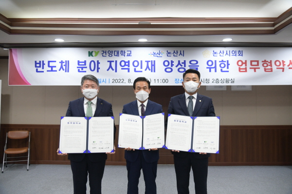 건양대학교(총장 김용하)와 논산시(시장 백성현), 논산시의회(의장 서원)가 31일 오후 논산시청에서 반도체 분야 지역인재 양성을 위한 업무협약을 체결하고 지역 내 반도체 인재 양성 및 논산시 스마트 국방산업 클러스터 구축에 힘을 모으기로 했다.