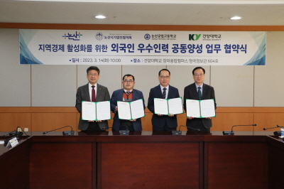 건양대학교(총장 김용하)는 14일 오전 건양대 창의융합캠퍼스 명곡정보관에서 건양대-논산시-논산시기업인협의회-논산공업고등학교 등 4개 기관이 지역경제 활성화를 위한 외국인 우수인력 공동양성 업무협약을 체결했다고 밝혔다.