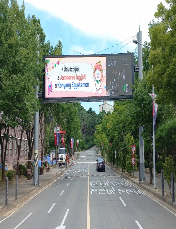 헝가리어로 잼버리 헝가리 참가대원의 건양대 방문을 환영하는 건양대 창의융합캠퍼스 전광판.jpg