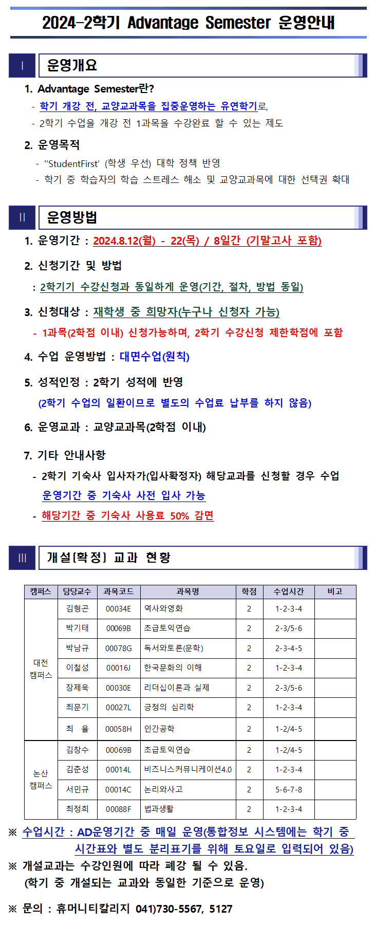 | 제목 | 2024-2학기 Advantage Semester 운영안내 | ||||