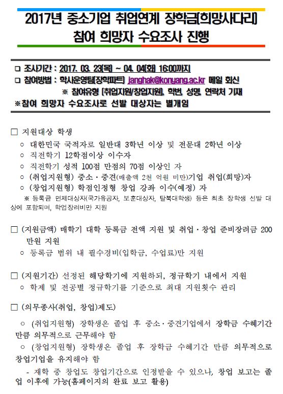 | 제목 | 2017학년도 중소기업취업연계장학금(희망사다리) 참여 희망자 수요조사 진행 | ||||