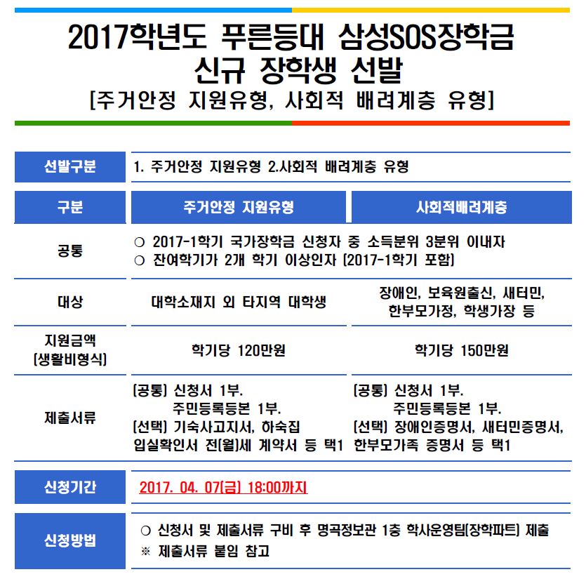| 제목 | 2017학년도 푸른등대 삼성SOS장학금 신규장학생 선발안내 | ||||