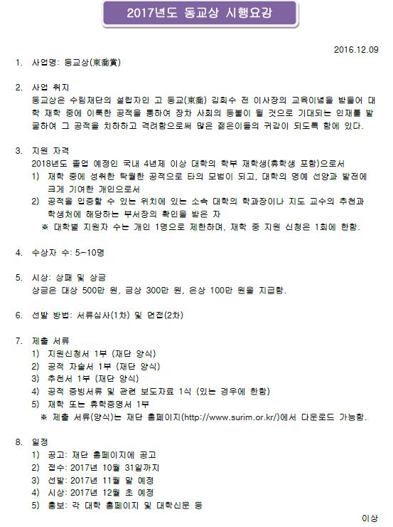 제 4회 동교상 장학생 선발공고 제출기한 : 2017. 10. 13(금)까지 제출방법 : 학사운영팀 장학파트 제출