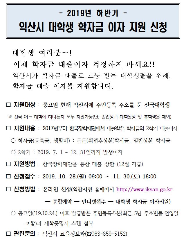 | 제목 | 2019년 하반기 익산시 대학생 학자금 이자 지원 신청 | ||||
