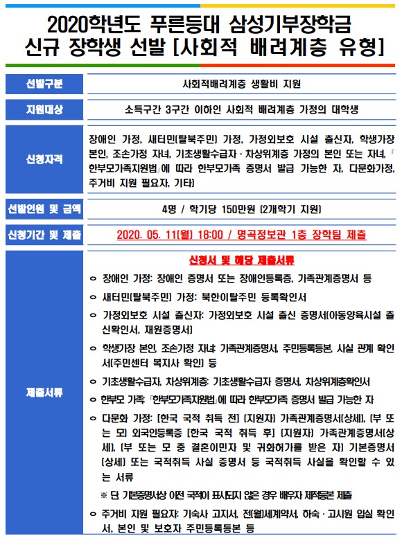 | 제목 | 2020학년도 푸른등대 삼성기부 장학생 선발 공고 | ||||