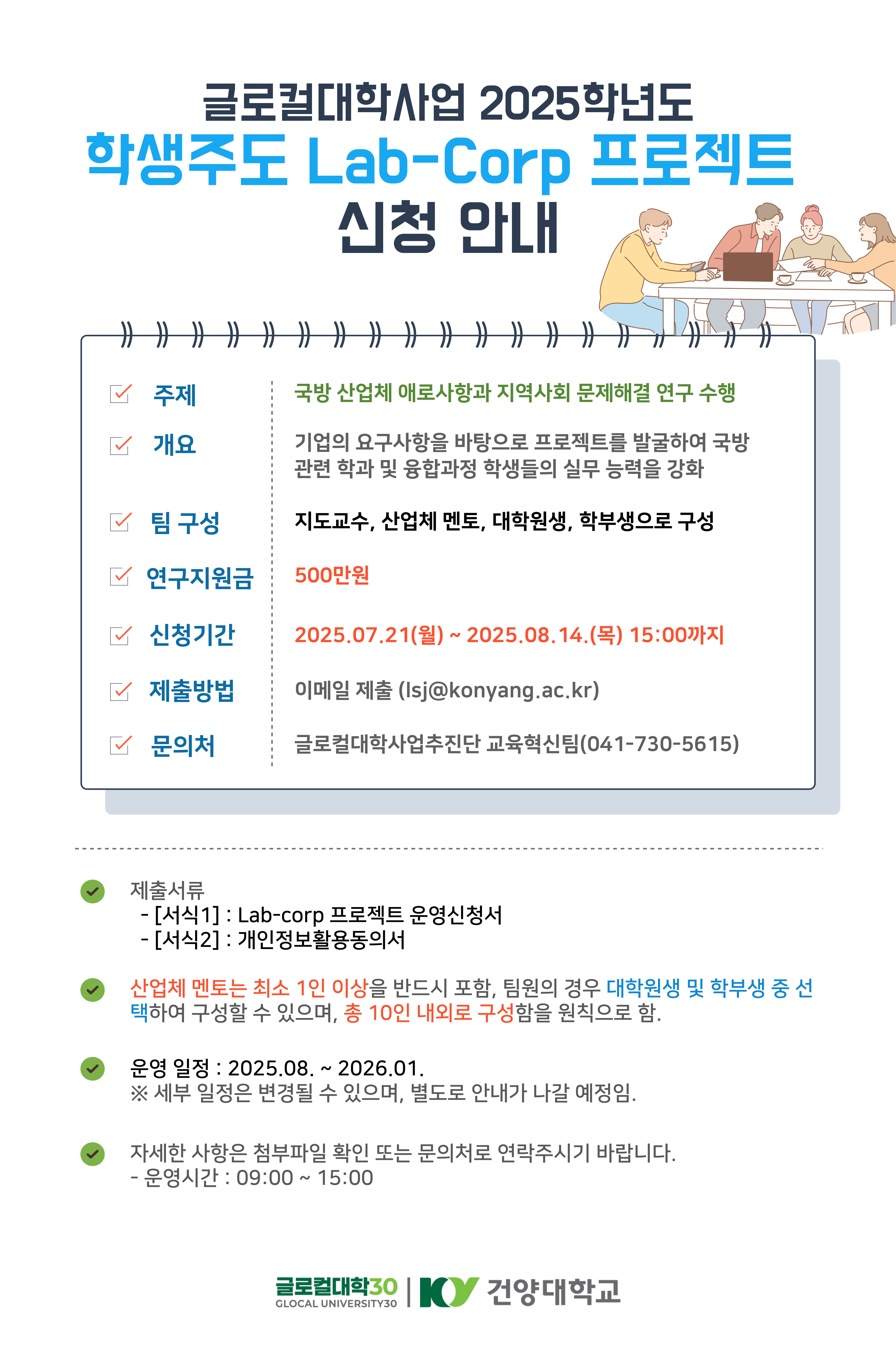 | 제목 | [글로컬대학사업] 2025학년도 학생주도 Lab-corp 프로젝트 모집 안내 | ||||