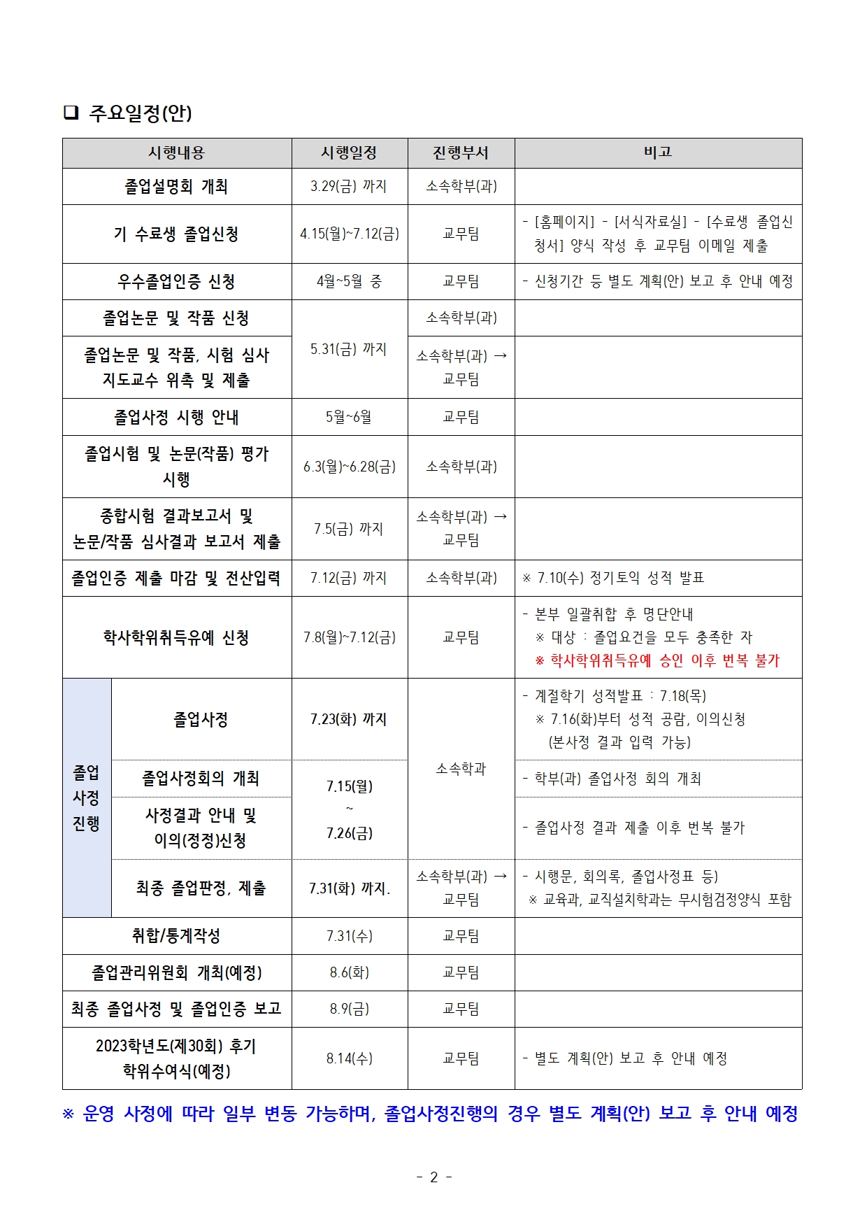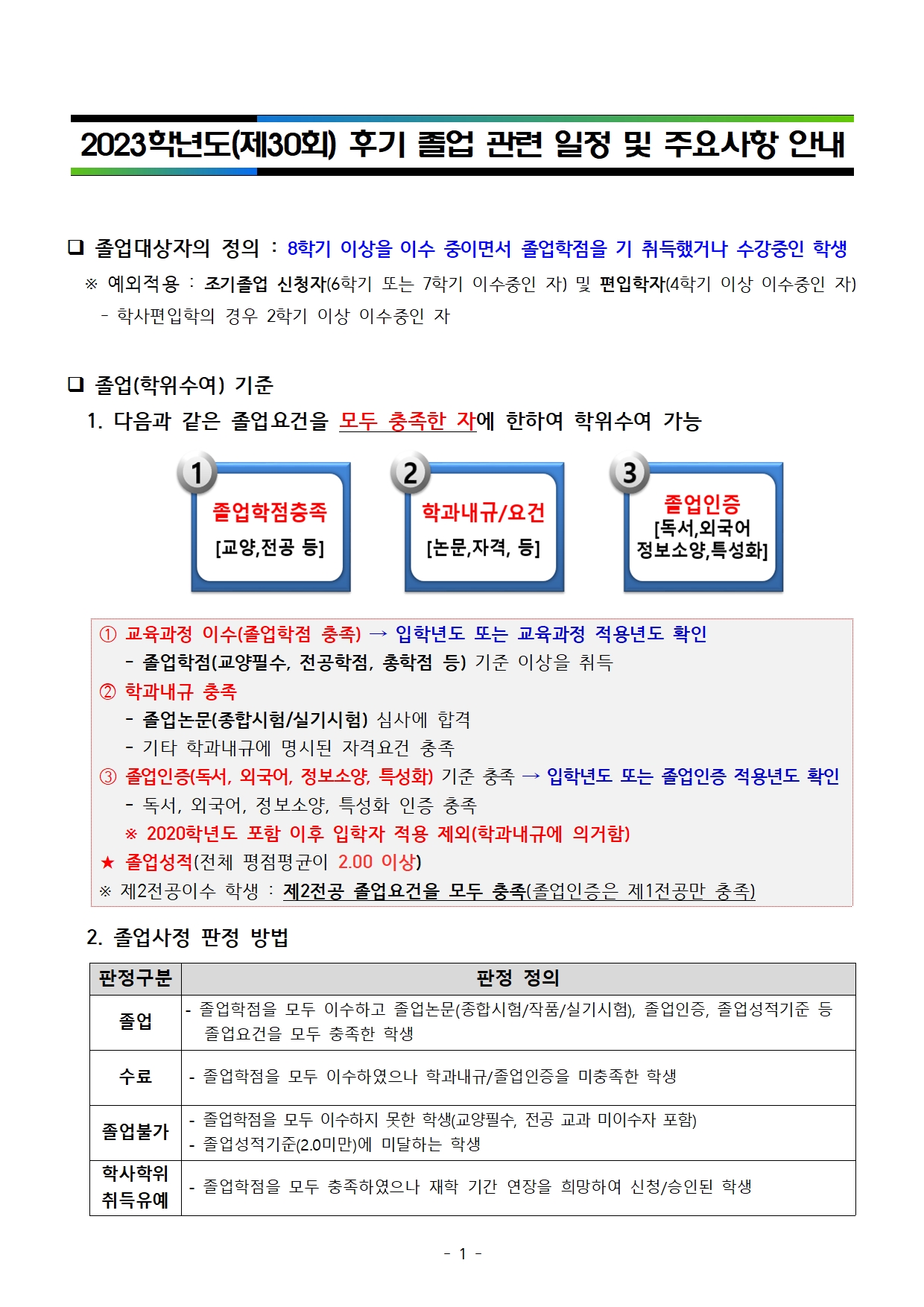 | 제목 | 2023학년도(제30회) 후기 졸업 관련 일정 및 주요사항 안내 | ||||