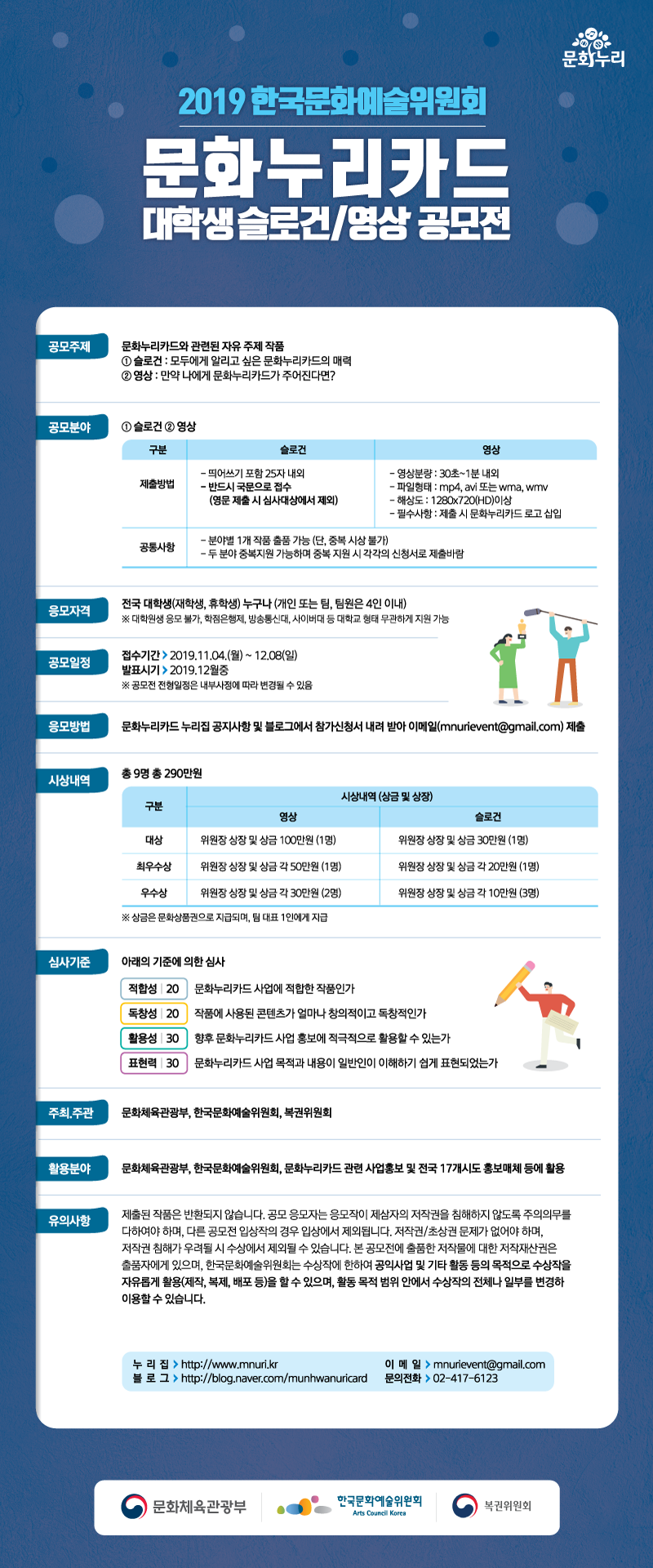 | 제목 | 문화누리카드 전국 대학생 대상 슬로건 영상 공모전 안내 | ||||