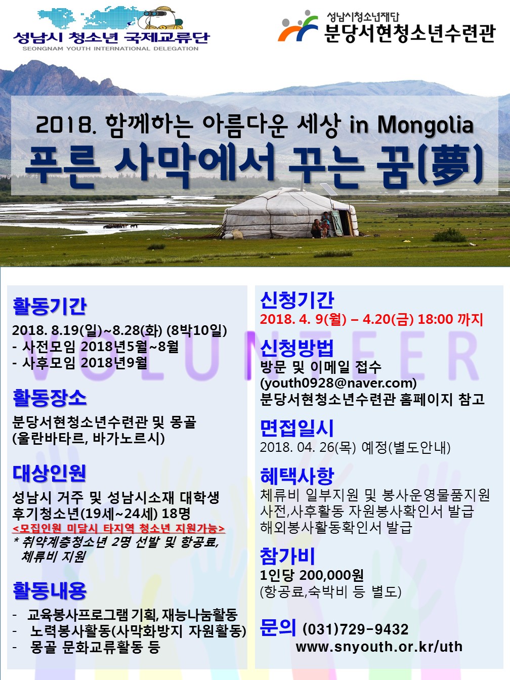 | 제목 | 성남시청소년재단 대학생 해외봉사 프로그램 참가자 모집 안내 | ||||