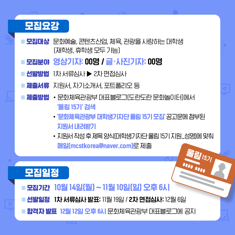 | 제목 | 문화체육관광부 대학생기자단 울림 15기 모집안내 | ||||