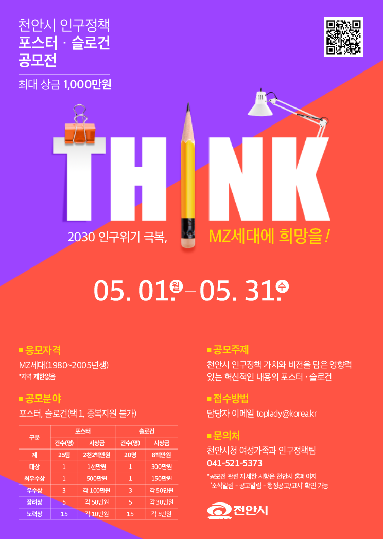 | 제목 | 『천안시 인구정책 포스터·슬로건 공모전』개최 안내 | ||||