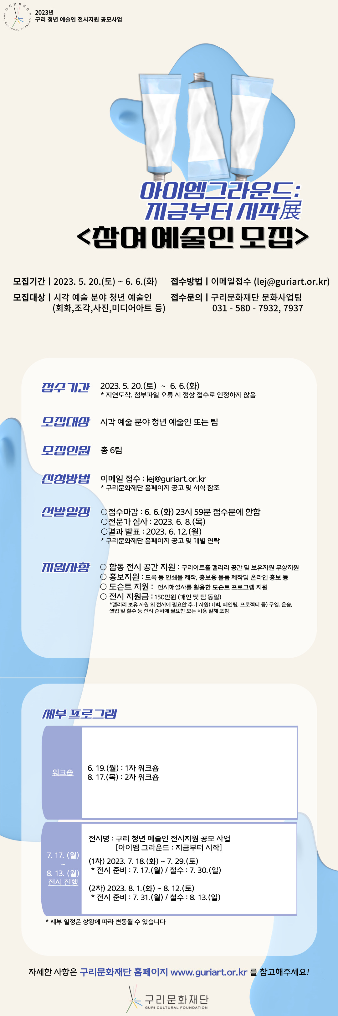 | 제목 | 구리문화재단 전시지원 공모사업 참여자 모집 안내 | ||||