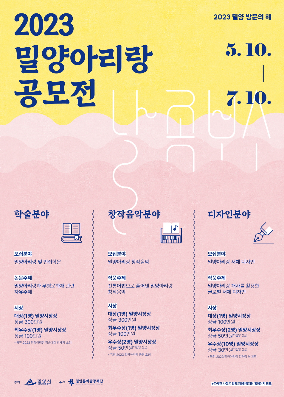 | 제목 | 2023 밀양아리랑 공모전 안내 | ||||