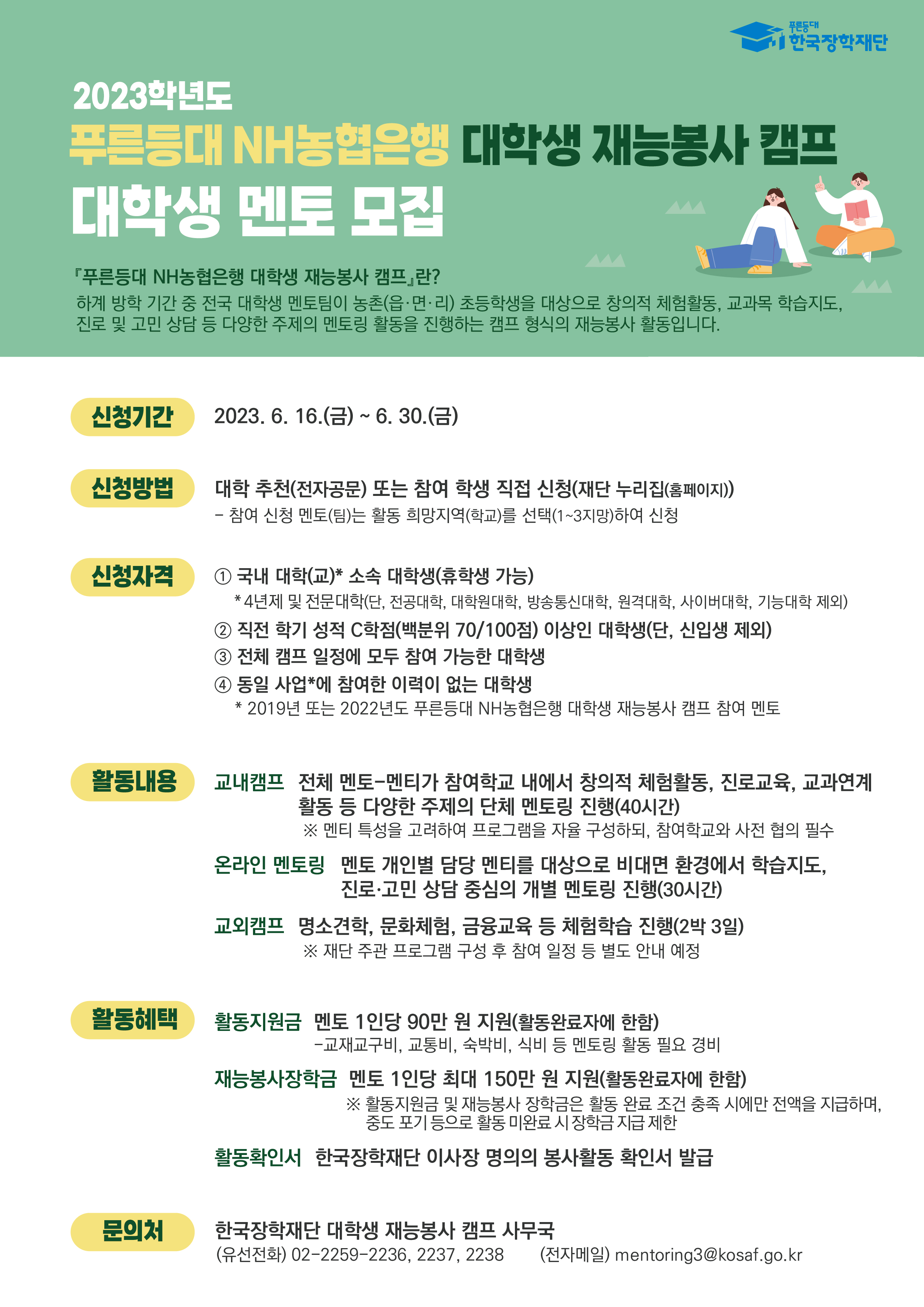 | 제목 | 2023학년도 푸른등대 NH농협은행 대학생 재능봉사 캠프 멘토(팀) 모집 안내 | ||||