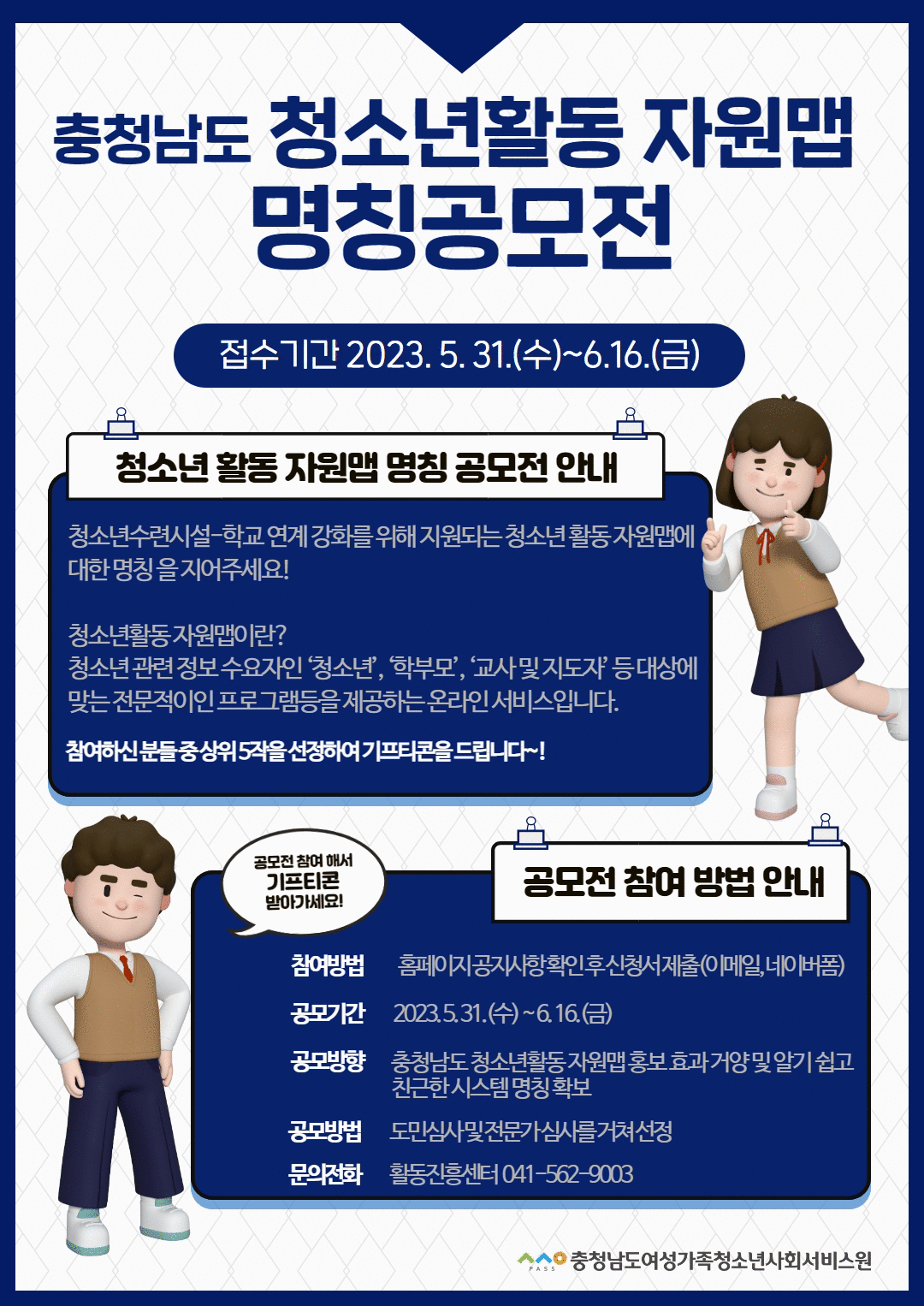 | 제목 | 충청남도 청소년활동 자원맵 명칭 공모전 안내 | ||||