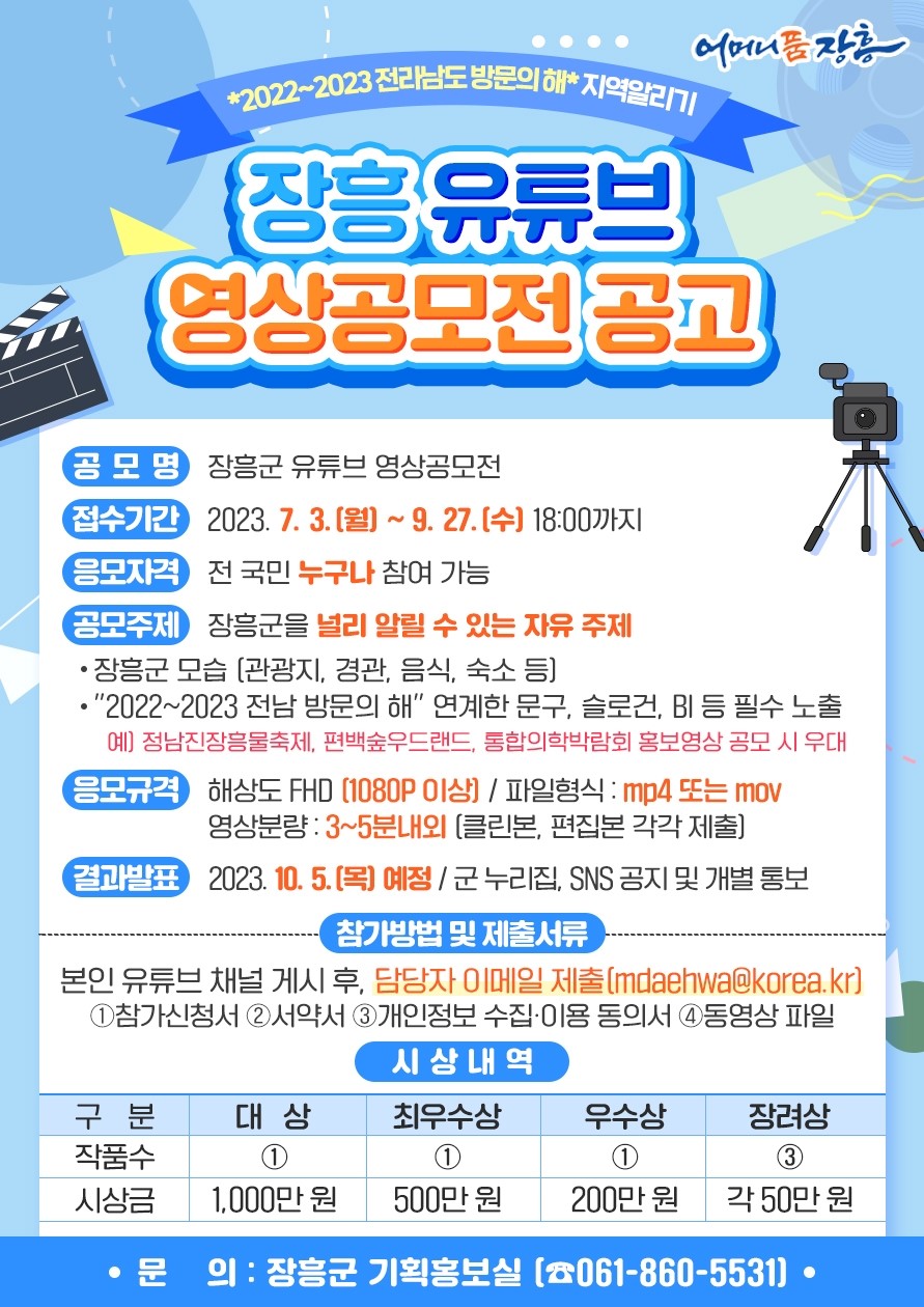 | 제목 | '2022~2023 전남 방문의 해' 지역알리기 장흥 유튜브 영상 공모전 안내 | ||||
