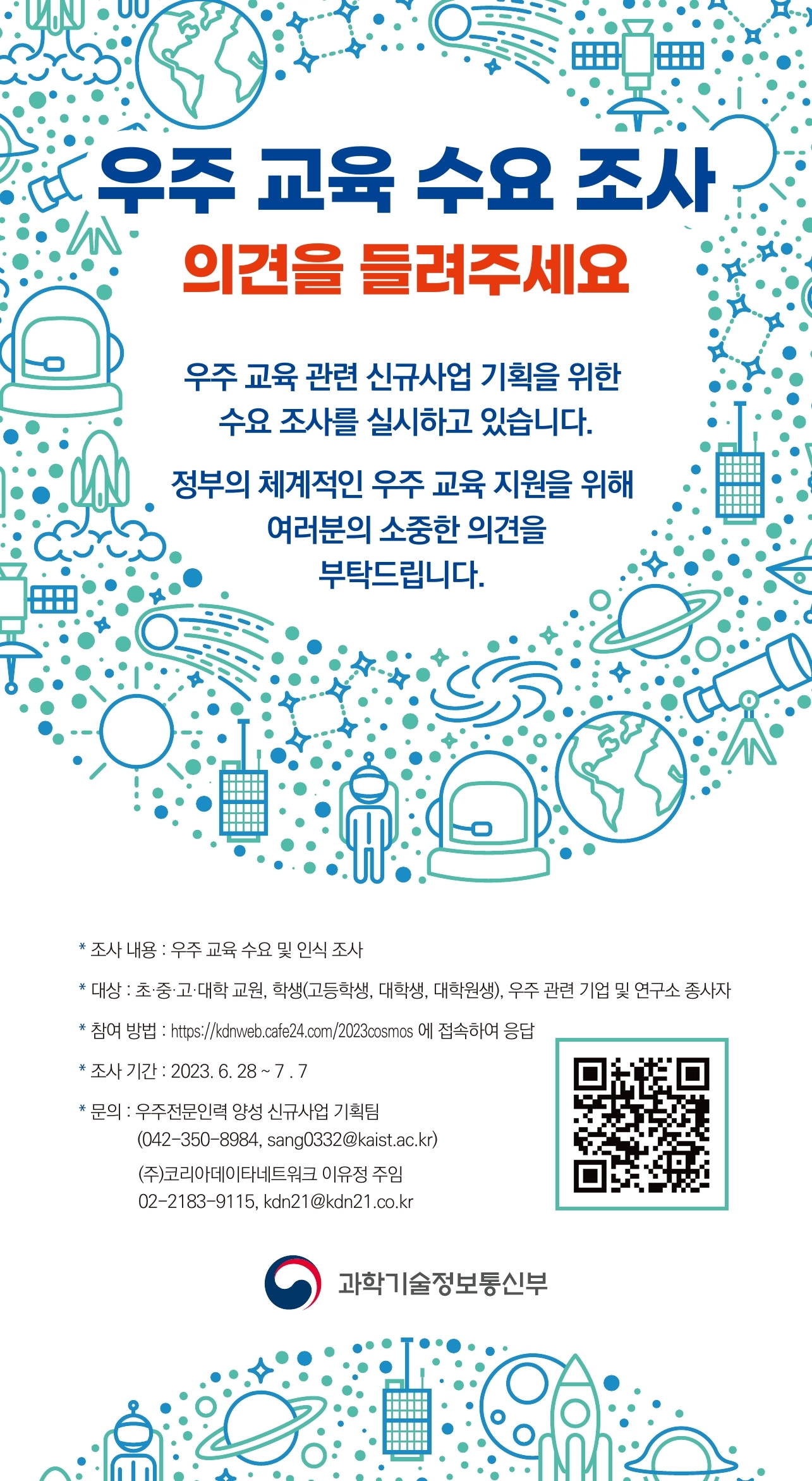 | 제목 | 우주전문인력 양성 신규사업 기획을 위한 설문조사 | ||||