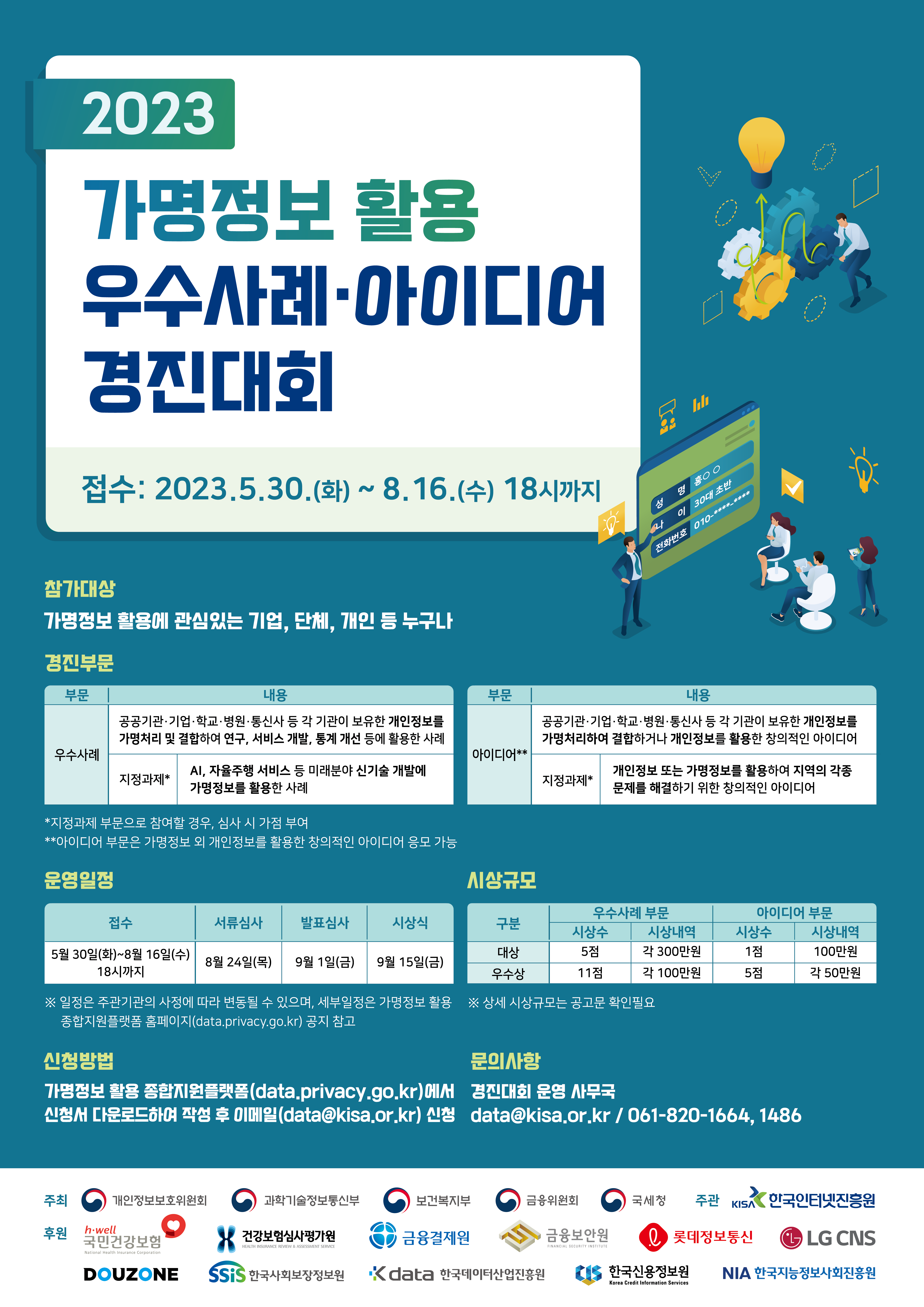 | 제목 | 2023 가명정보 활용 우수사례·아이디어 경진대회 접수기간 연장 안내 | ||||