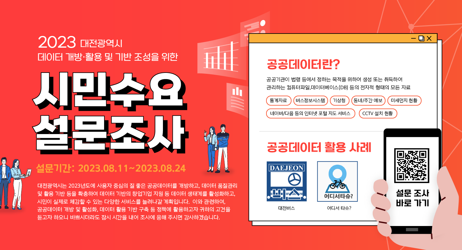 | 제목 | 「2023년 대전광역시 데이터 개방, 활용 및 기반조성을 위한 시민 수요 설문조사」 참여 안내 | ||||