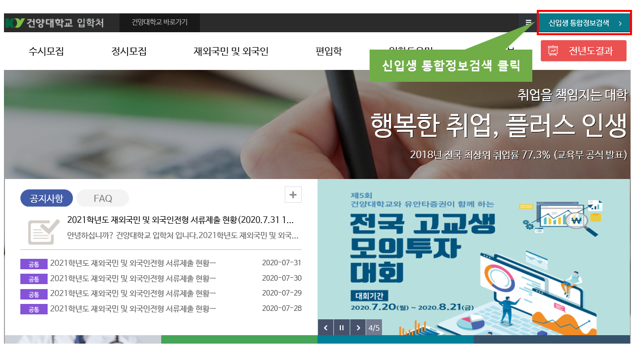 2. 조회방법 : 입학처 홈페이지 > 신입생 통합정보검색 > 로그인 > 조회 합격자 조회 링크 : http://ipsi.konyang.ac.kr/html/ipsi/total_info.jsp
