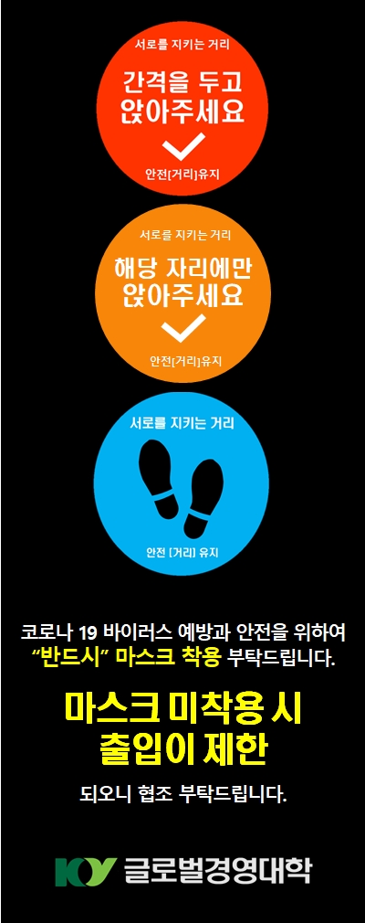 안녕하세요? 우리 글로벌경영대학은 5월 11일(월) 대면강의를 대비하여 코로나19 예방 스티커를 각 강의실 및 시설물에 부착하였습니다. 대면강의를 수강하러 오는 학생들은 해당 스티커가 부착되어있는 자리에만 착석해주시기 바랍니다. ※※※ 경상학관 출입 시 필수사항 ※※※ 코로나 19 바이러스 예방과 안전을 위하여 “반드시” 마스크 착용 부탁드립니다. 마스크 미착용 시 출입이 제한됩니다. |