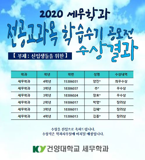 『 2020학년도 세무학과 전공교과목 학습수기 공모전 수상결과 』글의 상세내용을 확인하는 표로 제목, 부서명, 등록일, 조회, 첨부, 내용으로 나뉘어 설명합니다.