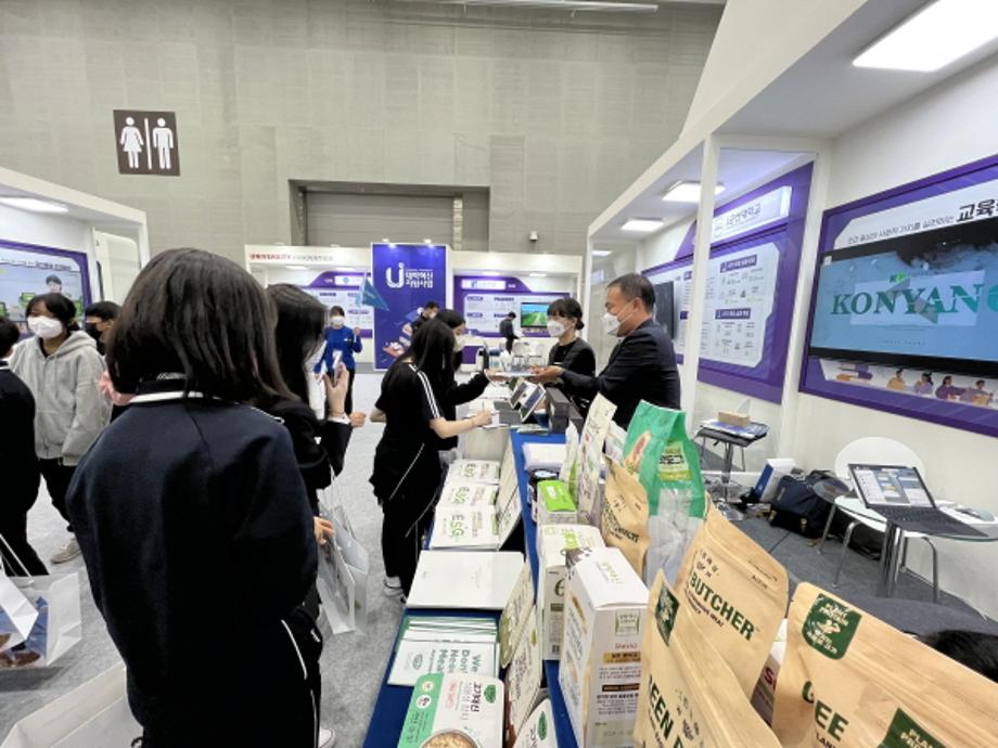 산학협력 EXPO에 방문한 관객들에게 대학 ESG 성과를 홍보하는 건양대 대학혁신지원사업단 관계자 1.jpg