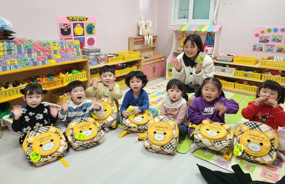 건양대 간호학과 아이조아 학생들이 어린이집 아동들에게 어둠속에서 빛나는 옐로카드를 가방에 달아주는 모습.jpg