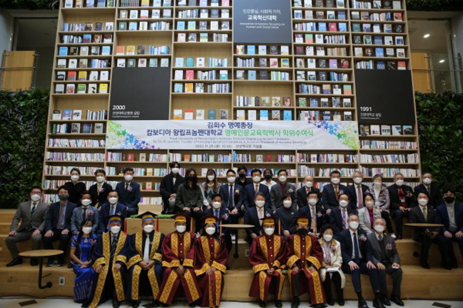 쳇 칠리 총장은 이어 “김 명예총장은 언어, 인종, 민족을 초월해 상호이해와 신뢰를 바탕으로 한 사람 중심의 업적을 남겼다. 명예박사 학위 수여를 기념해 왕립프놈펜대학 훈센도서관에 김희수 명예총장의 책장을 만들어 영원히 기억할 것”이라고 말했다.