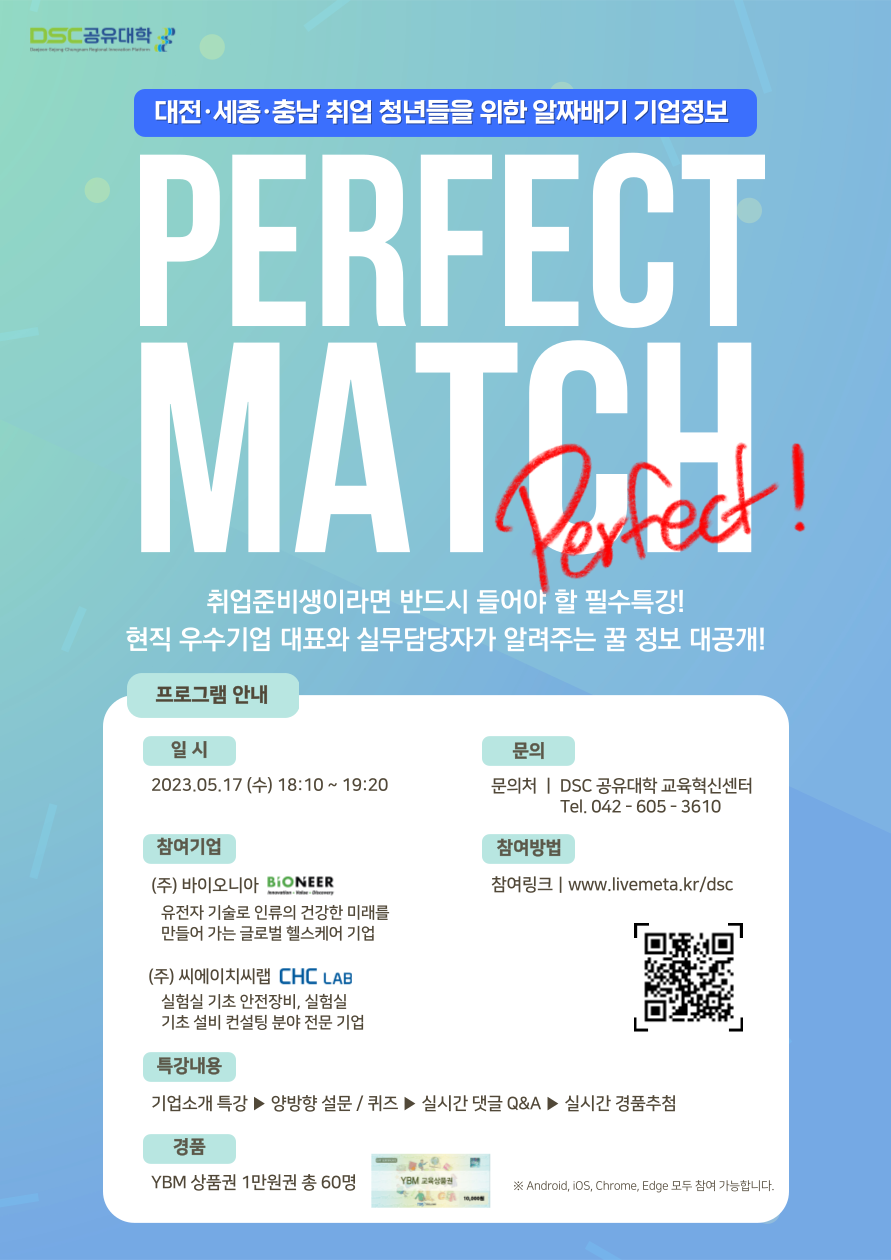 | 제목 | [DSC 공유대학] 2023학년도 DSC 공유대학 「산업체 인사특강: Perfect Match」 2회차 안내 | ||||