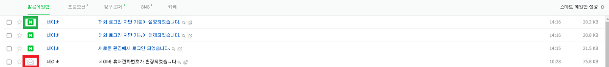 최근 네이버 고객 센터로 위장하여 사용자 계정 탈취를 목적으로 유포중인 악성메일이 식별되고 있어 사용자의 주의가 요구 됩니다. 정보통신원은 교내 사용자를 대상으로 네이버 고객센터를 사칭하여 ‘네ol버 휴대전화번호가 변경되었습니다’ 라는 제목의 악성메일이 유포된 정황을 식별 하였습니다. 해당 메일은 정상 메일로 위장하고 있으나 사용자가 주의를 기울이면 고객 센터 정상 메일과 식별이 가능 합니다. 아래 그림과 같이 정상 메일의 경우 네이버 로고가 표시되고 있으나 해당 악성 메일은 일반 메일과 같은 ‘편지’ 모양의 아이콘으로 되어 있습니다. 또한 발신자 정보 또한 ‘네이버’ 가 아닌 ‘네ol버’ 로 되어 있으며 발신 메일 주소 역시 정상적인 고객센터 메일 주소가 아닌 탈취가 의심되는 메일 계정을 사용하고 있습니다.