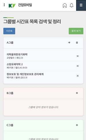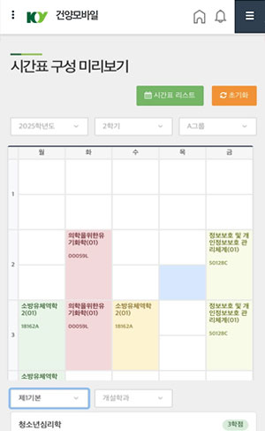 □ 경로 : 스마트키 로그인 > [건양모바일] 클릭 > 건양모바일 메뉴 > 수업 > 시간표 구성 미리보기, 학관별 시간표 조회