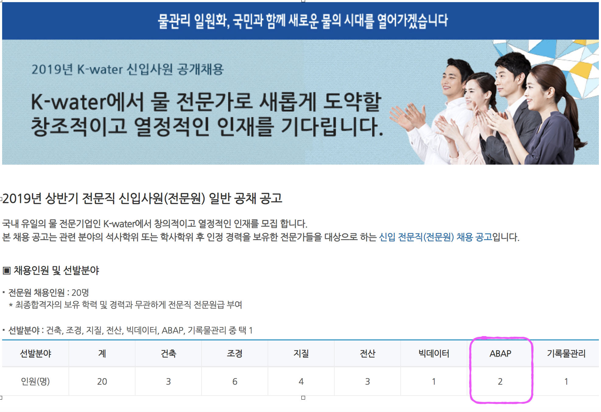 『 [채용정보] 한국수자원공사 ABAP 분야 2명 ( 2019년 2월 1일까지 ) 』글의 상세내용을 확인하는 표로 제목, 부서명, 등록일, 조회, 첨부, 내용으로 나뉘어 설명합니다.