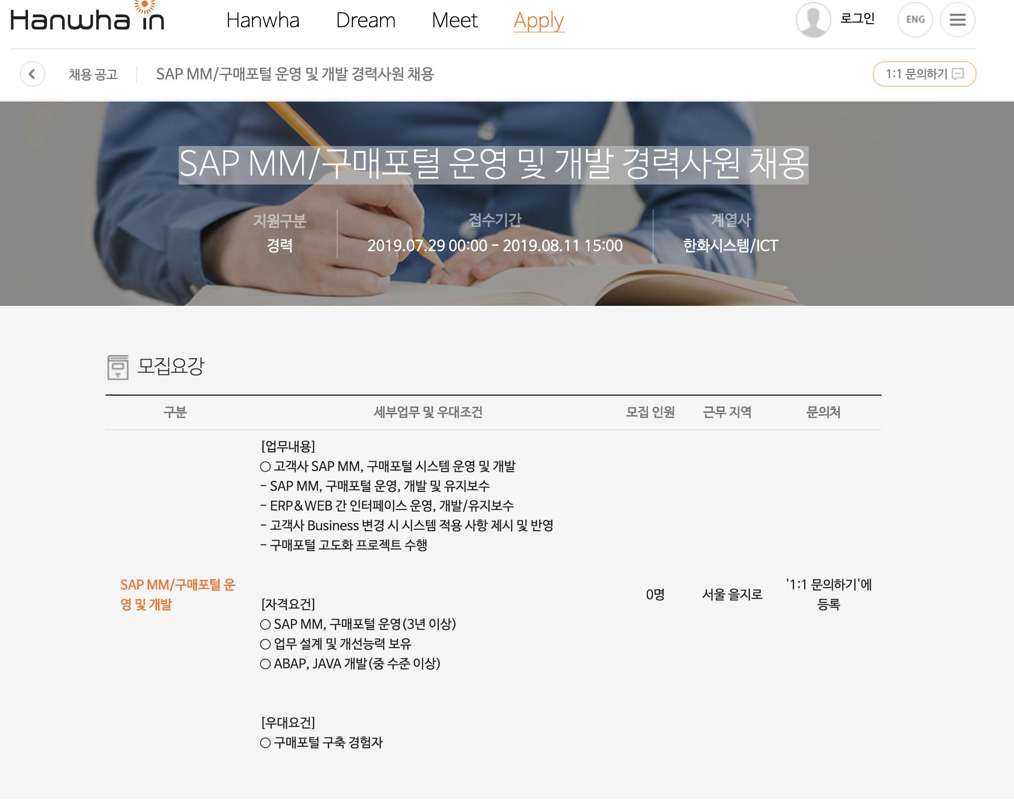한화시스템 SAP MM/구매포털 운영 및 개발 경력사원 채용정보입니다.