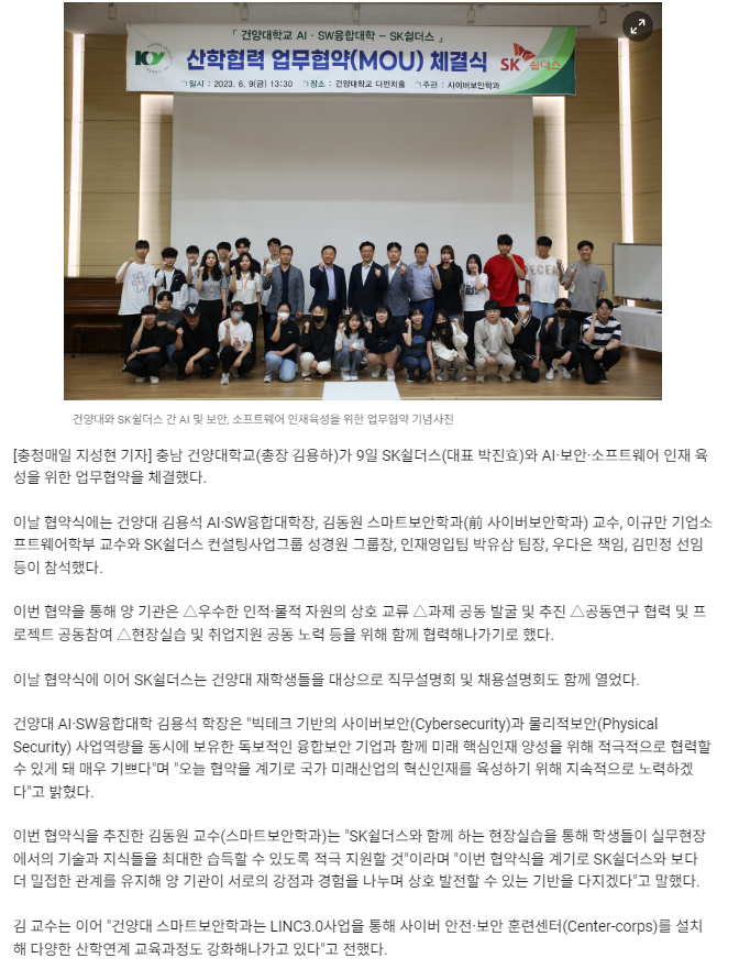 『 충남 건양대 스마트보안학과-SK쉴더스, AI·보안·소프트웨어 인재육성을 위한 MOU 체결 』글의 상세내용을 확인하는 표로 제목, 부서명, 등록일, 조회, 첨부, 내용으로 나뉘어 설명합니다.