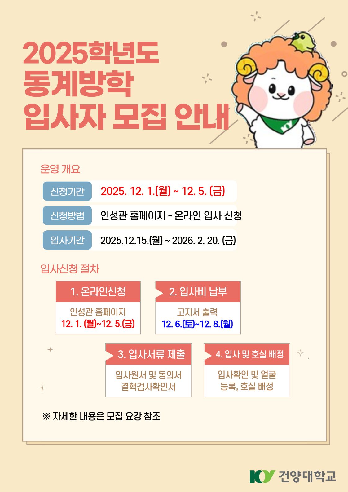 『 2025학년도 동계방학 인성관 입사자 모집 안내 』글의 상세내용을 확인하는 표로 제목, 부서명, 등록일, 조회, 첨부, 내용으로 나뉘어 설명합니다.
